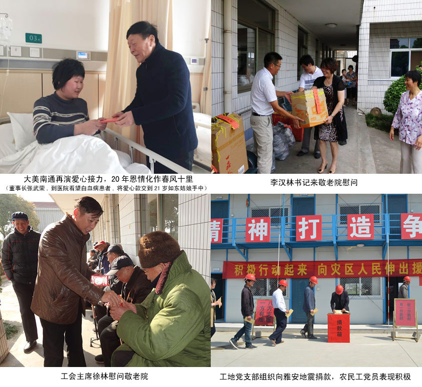公司成立二十五年以來,從初期連續(xù)十年支助二個孤兒開始,先后資助新疆伊犁多名貧困學(xué)生,連續(xù)多年看望慰問幸福敬老院、秦灶敬老院、唐閘敬老院、市北養(yǎng)老中心的老人,對素不相識的癌癥病人、重危病人、交通事故致殘人員、燒傷燙傷等病人給予醫(yī)療費支助,向四川汶川、雅安、青海玉樹、云南魯?shù)榈卣鹫饏^(qū)和鹽城6.23特大龍卷風(fēng)等災(zāi)區(qū)積極捐款,樂施港閘市政人的援助之手,為使愛心傳承更久遠(yuǎn),施援更高效,公司已分別在南通市慈善總會、港閘區(qū)慈善總會冠名了各100萬元的愛心基金,為特困人群雪中送炭,讓愛的種子、好人文化在港閘市政薪火相傳。